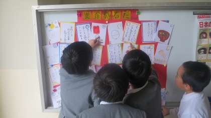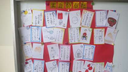 給食委員会の子どもたちが作った「食育カルタ」が掲示してありました。子どもたち自身が考えたカルタで、なかなか上手でしたよ。通りがかった子たちものぞき込んで、いいなと思うものをさがしていました。