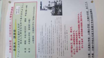 初春の候、保護者の皆様、地域の皆様にはますますご健勝のこととお喜び申しあげます。平素は学校教育活動及びPTA活動にご協力ご支援を賜り誠にありがとうございます。さて三校合同成人・人権啓発講座のご案内をいたします。下記の要領にて開催いたしますので、ご近所の皆様お誘い合わせの上、多数ご参加くださいますようご案内申しあげます。