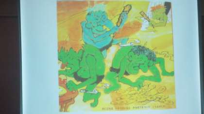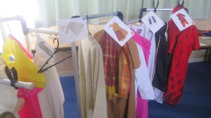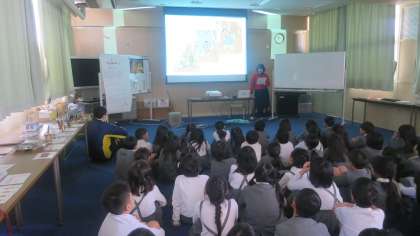 今週は「身近な国を知ろう」週間です。身近な国や地域の文化や生活習慣などにふれ、それぞれの国のよさを知り、認め合い理解しようとする心情を育てることがねらいです。3年生の授業をのぞいてみました。絵本や遊び、衣装や道具、楽器などを多目的室にそろえて、自由にさわれるようにしています。今日は民族講師の先生にも来てもらいました。プロジェクターを使って昔話を読んでもらったり歌を教えてもらったりしました。子どもたちはとても喜んでいました。日本と似ているところやちがっているところにも気づくことができました。