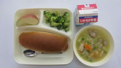 今日の給食のメニューは、豚肉と野菜の洋風煮、ブロッコリーのサラダ、りんご、牛乳、パン、でした。豚肉と野菜の洋風煮はたまねぎやキャベツ、じゃがいもの甘みがチキンスープにとけ出していて、塩コショウで味がしっかりとととのえられていました。ウインナーもたくさん入っていました。ブロッコリーのサラダはほのかに酸味が効いたドレッシングがかかっていてさっぱりとしていました。りんごは果汁たっぷりでおいしかったです。