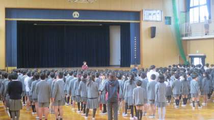 児童朝会がありました。今朝はそれほど冷え込みも厳しくなく、なんとなく生暖かい感じがしました。校長先生からは「立春」や「節分」についてのお話がありました。暦の上ではもう春ですね。次にインフルエンザについてのお話もありました。今年はインフルエンザに2回かかる人が多いとニュースで聞きました。手洗い・うがいをしっかりとしましょう。最後に先週に行われた「耐寒ミニマラソン」において、みんなの頑張りをほめてもらいました。今週も元気よく過ごしましょう。
