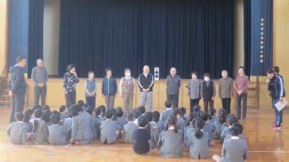 2時間目に大道南地域の老人会の方々に来ていただいて、「ふれあい昔遊び」を行いました。はじめに1年生の子どもたちが「よろしくお願いします」と元気よくあいさつをすると、老人会の方々もにっこり。それぞれのコーナーで子どもたちは遊び方を教えてもらいながら楽しく過ごしていました。子どもたちの楽しそうな声が体育館に響いていました。