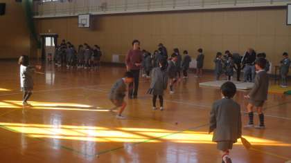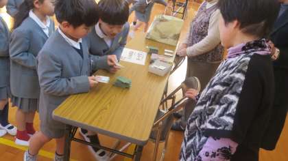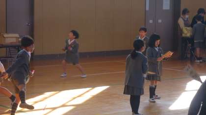 羽根つき、百人一首(坊主めくり)、お手玉、あやとり、けん玉、こま回しなどのコーナーがあります。お年寄りの方々ももちろんお上手なのですが、子どもたちの中にも結構上手な子が何人もいました。体育館の中は寒くなく、老人会の方々と子どもたちのふれあいでとてもあたたかい雰囲気に包まれていました。またお年寄りの方々とふれあうことで、思いやりのある健やかな心を育ててほしいと思います。3時間目には3年生も教えていただきました。老人会のみなさま、ありがとうございました。