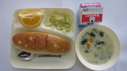 今日の給食のメニューは、ほうれん草のシチュー、キャベツのサラダ、いよかん、牛乳、パン、でした。ほうれん草のクリームシチューはじゃがいもがホクホクでやわらかく型崩れしていませんでした。手作りルウから作ったシチューがとてもまろやかクリーミーで、具材をやさしく包み込んでいました。キャベツのサラダはりんご酢としょうゆで作られたドレッシングがかかっていておいしかったです。いよかんは果汁が多くみずみずしかったです。