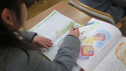 1年生の子どもたちが道徳の授業をしていました。「ハムスターの赤ちゃん」という「いのち」について考える教材を読んで、子どもたちなりにいろいろな考えを発表していました。