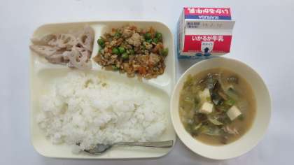 今日の給食のメニューは、鶏ごぼうご飯、干しずいきのみそ汁、焼きれんこん、牛乳、でした。鶏ごぼうご飯はしょうが汁で下味がつけられた鶏挽肉の香りが効いていて、甘めに味つけられたにんじんやごぼう、こんにゃくをご飯にまぜると、さらに味がひきしまった感じがしました。干しずいきのみそ汁はぬるま湯でもどした干しずいきの食感が楽しめました。焼きれんこんは塩少々の味付けなのでれんこんそのものの味を味わうことができました。