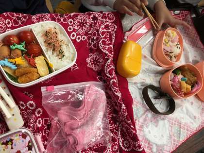 たくさん活動したあとは、お弁当タイムです。おうちの方の心のこもったお弁当、ありがとうこざいました。子どもたちはお腹を空かしていて、わいわいおしゃべりしながらもお腹いっぱい食べていました。