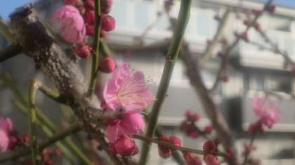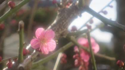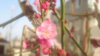 まだほとんどがつぼみですが、気の早いつぼみがかわいらしいピンク色の梅の花を咲かせていました。春の息吹が感じられます。