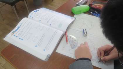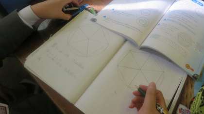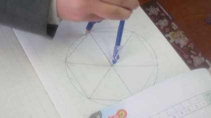 円の中心のまわりの角を等分して半径を描き、円と交わった点を頂点にして描く方法があります。正六角形についてはコンパスで半径の長さを測って円周を区切っていく方法もあります。子どもたちにはていねいに作図するように指導しています。みんな落ち着いて正確に描こうと努めていました。