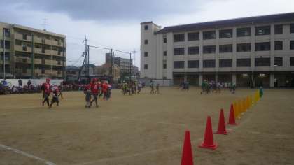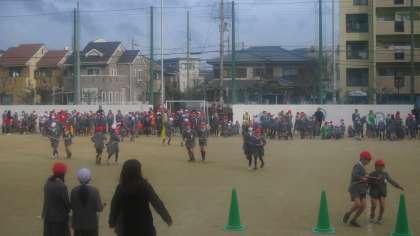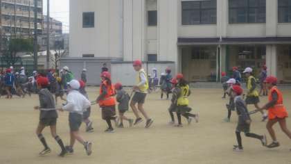 児童集会がありました。今日は「しんぶんリングリレー」でした。新聞で作ったわっかに2人の子どもが入ってリレーをします。わっかに入る2人はちがう学年でないといけないルールです。からだの大きさもちがうので、お互いに息を合わせないとうまくいきません。急ごうとすると新聞がちぎれてしまうので要注意です。子どもたちは音楽に合わせて楽しそうに活動していました。みんな寒さに負けていません。