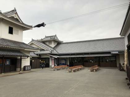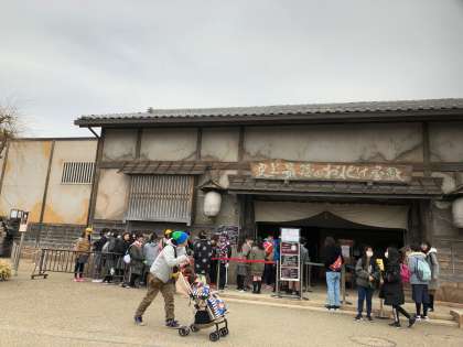 お昼には休憩所に集まってお弁当を食べました。下はおばけ屋敷で並んでいるところです。感想を聞くと、怖かったとのことです。