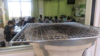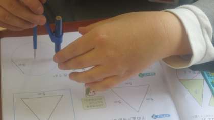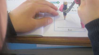 3年生のくつ箱に七輪がおいてありました。むかしのくらし体験で七輪を使うみたいです。おもちを焼くらしいですよ。楽しみですね。その七輪の向こうで3年生の子どもたちがコンパスを使って「三角形」を描く練習をしていました。二等辺三角形や正三角形を描いていきます。コンパスでちょんちょんとしるしをつけて、定規で線をひきます。みんな上手にできました。