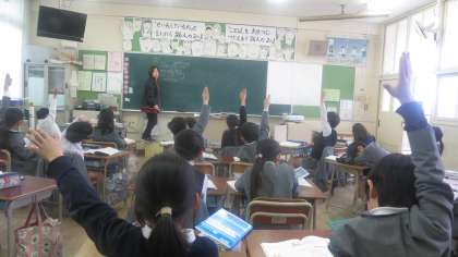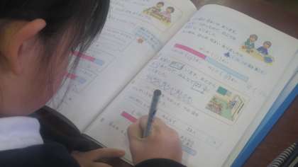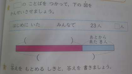 2年生が算数の授業で文章問題に取り組んでいました。利用するのは「線分図」です。図に表しながら考えていき、式をつくっていきます。「はじめの人数をもとめるには、全体の23人から、あとから来た8人をひきます。」・・・せいかい(*^▽^*)子どもたちは元気いっぱいに発表もしていました。