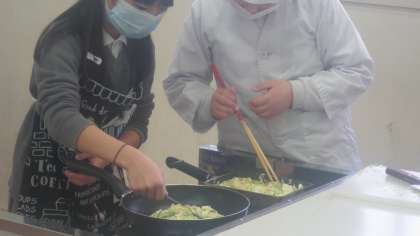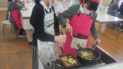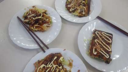 うまくできたかな。子どもたちは焼き具合が気になるのか、しょっちゅうお好み焼きのうらを持ち上げて確認していました。「もういいかな」「まだかな」…、よし、いい感じで焼けました。ソースとかつおぶしをふりかけてと。はい、できあがりー。子どもたちは「おいしい」「すくないわ」「もっとたべたいぞ」・・・、またお家でつくってくださいね。(*^▽^*)