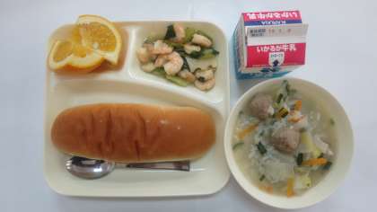 今日の給食のメニューは、えびとチンゲンサイの炒めもの、中華がゆ、はっさく、牛乳、パン、でした。えびとチンゲンサイの炒めものはえびはぷりぷりしていてとろみもあり、少し濃いめに味つけられていました。中華がゆはしいたけのもどし汁が効いていてしつこくなくあっさりとした仕上がりで体によさそうでした。肉団子がやわらかくごま油の風味もしました。はっさくは果汁たっぷりで甘さと酸味の両方が感じられました。