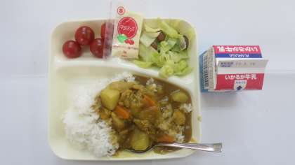 今日の給食のメニューは、チキンカレーライス、金時豆と野菜のサラダ、プチトマト、牛乳、でした。チキンカレーライスは鶏肉がにんにくとセロリで香りよく炒められていて、ルウの中に入っても風味が感じられました。じゃがいもやにんじんもやわらかく煮られていて辛さも子どもたちにちょうどよい辛さでした。金時豆と野菜のサラダは金時豆はやわらかく甘さもありキャベツやきゅうりと合わさってさっぱりとしていました。プチトマトは冷たくてみずみずしかったです。