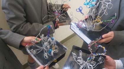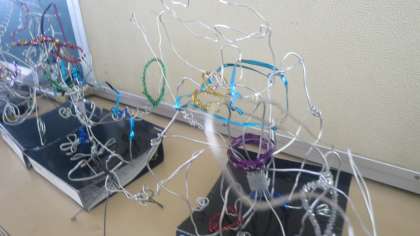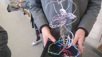 5年生が図工で針金工作に取り組んでいました。アルミの針金をペンチやその他の道具を使って、とめたり、ねじったり、まいたり、ぐるぐるにしたり、形をつくったりしながら想像力をはたらかせて思い思いに手を動かしていました。はじめは何をつくるか決めていないのですが、作業を進めていくうちにぼんやりと自分がつくりたいものが見えてくるようです。みんなしっかりと自分のひらめきを生かして上手に表現していました。