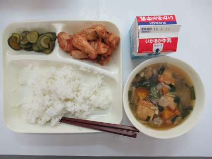 今日の給食のメニューは、鶏肉のチリソース焼き、中華煮、きゅうりの中華和え、牛乳、ごはん、でした。鶏肉のチリソース焼きは鶏肉にはケチャップやトウバンジャン、その他調味料でしっかりと下味がつけられていて、甘辛く味つけられていました。鶏肉はやわらかく食べやすかったです。中華煮はとろみがあっていつまでも温かく、野菜たっぷりで上手に中華スープの素で味がととのえられていました。きゅうりの中華和えはシャキシャキしていてごま油の香りが効いていました。