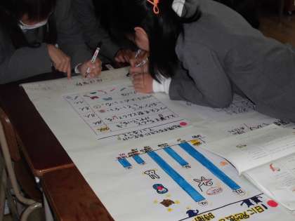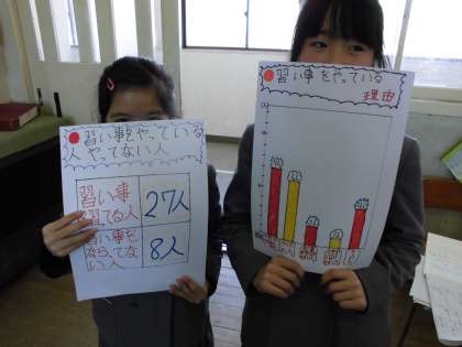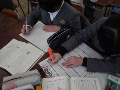 4年生が国語の授業で、調べたことをわかりやすく報告する学習をしていました。自分たちでいろいろなテーマを決めてアンケートをとったり取材をしたりしたことをポスターや表・グラフに表して、資料づくりに取り組んでいました。このあと聞き手にわかりやすく説明できるように原稿作りにも取り組むようです。上手に報告できるといいですね。