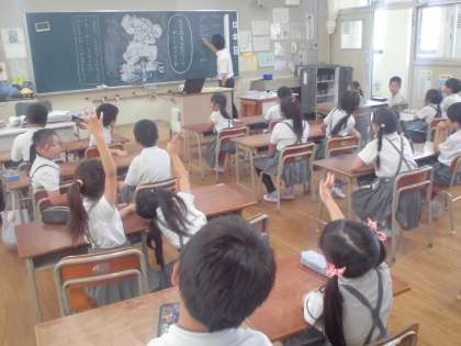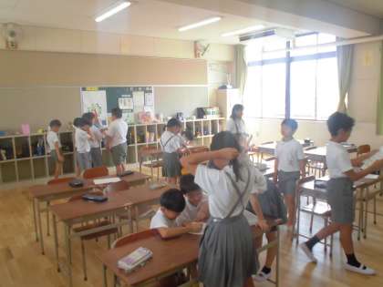 2時間目に全クラスの様子を見て回りました。写真は5.2.3年生です。どのクラスでも夏休みの出来事や楽しかったこと、頑張ったことなどの思い出を発表したり、2学期の学習内容や取り組む行事について先生が伝えたり、2学期の目標をみんなで考えたり、宿題を集めたり、係活動を決めたり、ゲームをして遊んだり…、各クラスにおいていろいろな活動が見られました。どのクラスのどの子どもたちも久しぶりに教室に入って、少し新鮮な気持ちを味わっているようでした。もちろん先生たちも2学期の始まりに気持ちも新たにして、とても張り切っていました。