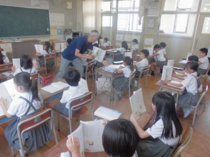 2年生の子どもたちの詩を読む声がろう下まで聞こえてきました。元気で明るい声です。国語の教科書に載っている「いろんなあめのおと」という詩を読んでいました。