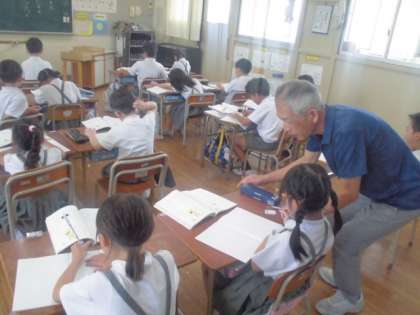 落ちてきた雨が葉っぱや窓、かさ、ほっぺた、手のひらなどに当たったときの音をいくつかの言葉で表現しています。「もしもみんなならどんな音に聞こえるかな」と先生がたずねると、子どもたちは元気よくいろんな考えを発表していました。やる気いっぱいの2学期スタートを迎えている2年生の子どもたちの姿が見られました。