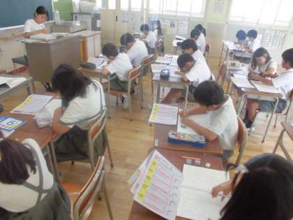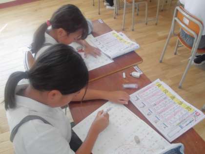3年生の教室の前を歩いていると、みんなとても静かです。何をしているのかなとのぞいてみると、漢字の練習をしていました。漢字ドリルを見ながら、みんな黙々と集中してノートに漢字を書いていました。朝の1時間目からすごい集中力ですね。テレビ画面に新出漢字を映して、先生と一緒に読み方や書き順、その漢字を使う場面などを確認したりもしていました。「一文字一文字ていねいに書きましょう」という先生の指示をよく聞いて、子どもたちは本当に静かに集中して頑張っていました。