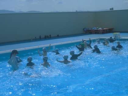 1年生の子どもたちもプールに入りました。「ねことねずみ」は体ほぐしの運動の一つで、楽しく体を動かす運動遊びです。2つの列を作り、一つはねずみ、もう一つはねこのグループとします。先生が「ね、ね、ね・・・ねずみ!」と叫ぶとねずみが逃げてねこが追いかけます。反対に「ね、ね、ね・・・ねこ!」と叫ぶとねこが逃げてねずみが追いかけます。単純な遊びですが、とても盛り上がる運動遊びです。運動場でするのが普通ですが、プールでも取り入れてみました。案の定、1年生の子どもたちは大盛り上がりでした。キャーキャー言いながら追いかけたり追いかけられたり…。プールににぎやかな声を響かせていました。