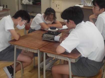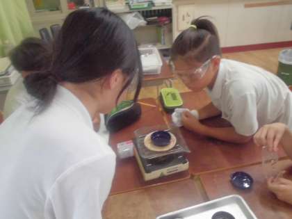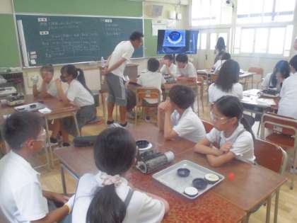 6年生が理科の授業で「水溶液の区別」の実験していました。先生が5種類の水溶液を用意してくれました。食塩水、炭酸水、薄い塩酸、重曹水、薄いアンモニア水です。見た目にはほぼ違いはありません。子どもたちは2つの視点から観察することにしました。まずはにおいです。次に蒸発させて残ったものを観察します。においがするもの、白い粉が現れるもの…同じように見える水溶液も少しずつ違いを見つけることができました。もっと知りたいことはありますか?…、これから子どもたちは仮説のもと、さらに細かい実験を重ねて水溶液の区別の仕方を勉強していきます。