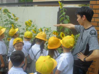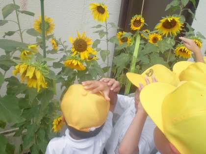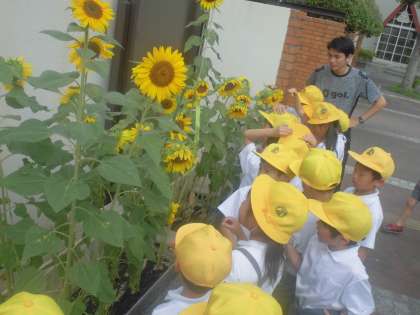 「いっしょくらいの高さやでー」「ほんまや同じやー」「ぼくの背よりも高いわー」…。1年生の子どもたちが自分たちが植えて育てているひまわりを見にやってきました。先生や友だちとひまわりの高さにについて話していました。「みんなと一緒くらいの高さもあれば、もっと高いのもあるね」「ひまわりの花の形ってどんなふうになってるかな」…「せんせー、ちいさい虫おるでー」「ハチとちゃうか」「せんせい、ハチの写真とってー」…、ほのぼの空気を出しまくる無邪気な1年生の子どもたちでした。