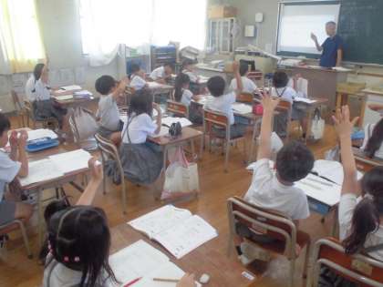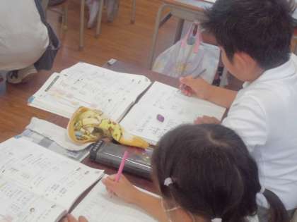 2年生の子どもたちが算数の授業でくり上がりのある筆算の勉強をしていました。例えば、76+58などです。一の位は6+8=14となり十の位に1くり上がります。十の位はくり上げた1と7で8、8+5=13となり、76+58=134が正解です。子どもたちは先生と一緒に確かめながらていねいにノートに式を書いていきます。「今日は練習問題がたくさんあるからね」という先生の言葉に「えー?」「何問あるの?」「12問ーっ!」「大丈夫できるできるー」…子どもたちの元気な声が返ってきました。それにしても積極的に手をあげてよく答える子どもたちが多い2年生です。
