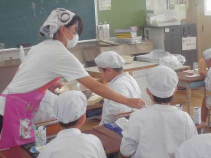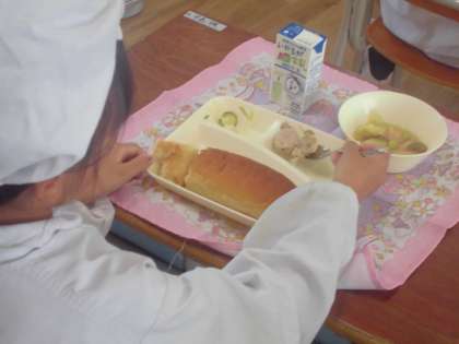 今日の給食のメニューは、鶏肉のバジル焼き、ベーコンと野菜のスープ、キャベツときゅうりのサラダ、牛乳、パンでした。豚肉のバジル焼きは鶏肉にワイン、塩、粗挽きこしょう、バジル、オリーブ油で下味をつけてから風味豊かに焼き物機で焼き上げています。ベーコンと野菜のスープは洋風の煮物で彩りもきれいで、具材にもしっかりと味がしみ込んでいておいしかったです。マッシュルームの食感がポイントです。キャベツときゅうりのサラダは蒸したキャベツときゅうりにワインビネガーを使ったドレッシングを和えて、さっぱりとした口あたりに仕上げています。