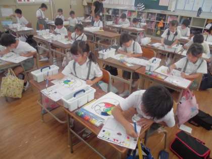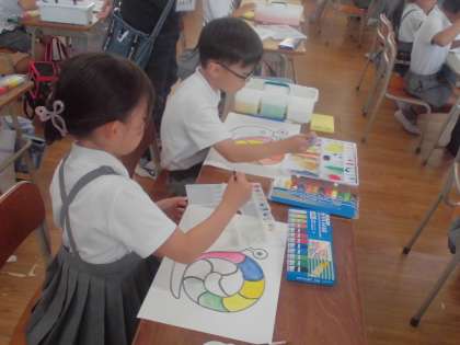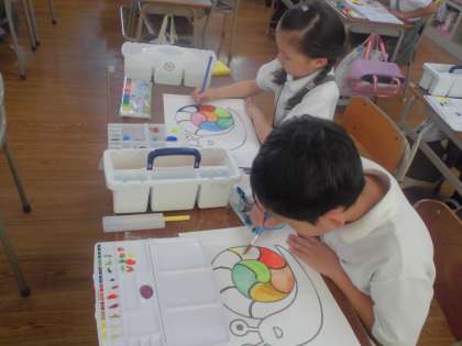 2年生の子どもたちが図工の授業ではじめての絵の具です。自分の絵の具セットを机の上に並べて、みんなにこにこ笑顔です。パレットの小部屋にいくつかの色の絵の具を少しだけ出します。水加減を調節して実際にぬってみたら「見て見てものすごくきれいだよ」。カタツムリの線からはみ出ないようにゆっくりていねいにぬっていきます。ひっせん(水入れ)の使い方も教えてもらいました。つけ水、すすぎ水、あらい水と場所によって用途が違います。こぼさないように筆を入れていきます。カラフルに虹のように色がぬられたカタツムリの絵は、晴れやかな子どもたちの気持ちを表しているように見えました。