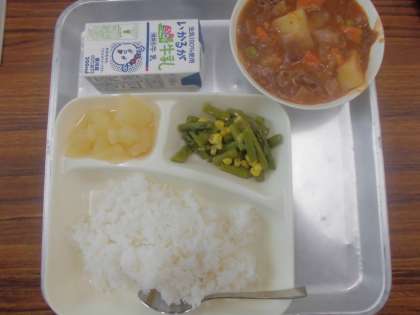 今日の給食のメニューは、ハヤシライス、グリーンアスパラガスとコーンのサラダ、洋なし(缶)、牛乳でした。ハヤシライスは牛肉の旨みが十分にとけ出していて、じゃがいもやにんじんもやわらかく煮られていてまろやかでした。子どもたちも大好きでカレーと同じくらい人気があります。グリーンアスパラガスとコーンのサラダは蒸したグリーンアスパラガスとコーンにワインビネガーを使った甘酸っぱい香りのドレッシングがかかっていました。洋なし(缶)は冷えていて甘かったです。