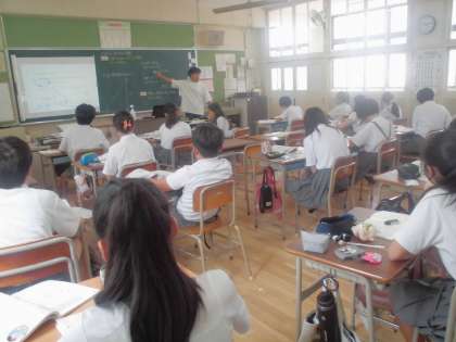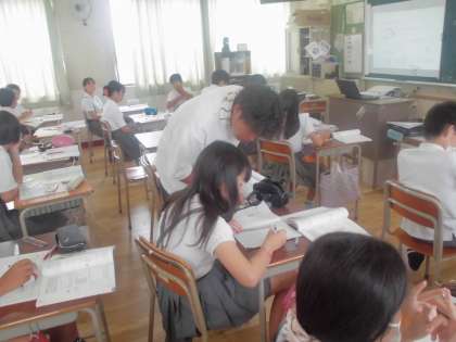 6年生の子どもたちが「拡大図」や「縮図」の勉強をしています。今日は縮図を作図して実際の長さを計算で求める問題です。例えば、建物の高さや川の幅などの実際には直接測れない長さを縮図を使って考えていきます。この方法だと校舎の高さとかも求めることができるので、学習した後に何か試しにチャレンジしてほしいと思います。「ねぇわかる?」「わかんないかも?」「だよねー!」…なんて会話が聞こえてきそうですが、大丈夫、ねばり強く頑張ってね。(3枚目)