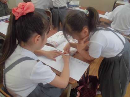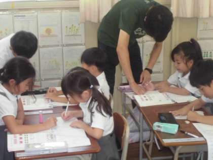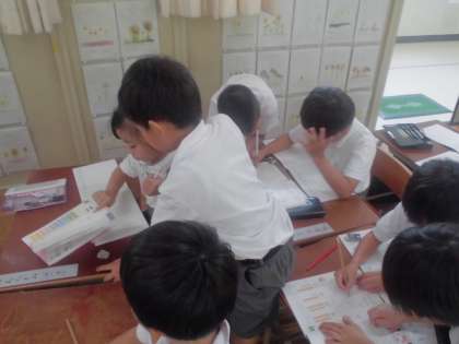 「わからない人いませんかー」「おしえてほしい人いませんかー」…「はい、ここにいますよー」「おしえてくださいー」…、1年生の算数の授業の一コマです。先生が「できた人はできていない人に教えてあげてくれるかな」と伝えたとたん、あちこちから声があがります。1年生の子どもたちは教えてあげるのも教えてもらうのも大好きみたいです。先生が「答えを教えるのではないですよ」と注文もつけます。ちっちゃい先生たちは指を使って数えたり図を指さたりしながら、何とかわかってもらおうと頑張っていました。