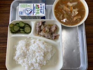 今日の給食のメニューは、鶏肉の塩こうじ焼き、さつまいものみそ汁、きゅうりの甘酢和え、牛乳、ごはんでした。鶏肉の塩こうじ焼きは鶏肉に塩こうじで下味をつけて、玉ねぎを混ぜ合わせて焼いています。塩こうじにはビタミンやアミノ酸などが多く含まれていて健康を増進する効果があり、また消化を助ける働きもあります。さつまいものみそ汁は煮干しでだしをとり、秋が旬のさつまいもを使って少し甘めの子どもたちの好きな味に仕上げています。きゅうりの甘酢和えはあっさりさっぱりとしていました。