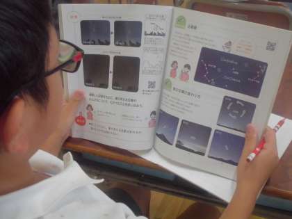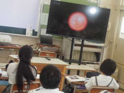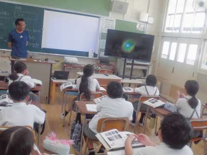 4年生の子どもたちが理科の授業で「星の位置の変わり方」について勉強しています。星の見える位置は時刻とともに変わっていくけど、星の並び方は変わらないんだね。なかなか大阪で実際に星を観察することは難しいので、どうしても天体に関する学習は資料や映像が中心になってしまいます。「星も太陽や月と同じように東→南→西へと動くんだね」「北の空は北極星を中心に反時計回り動くのか」…視覚的にわかりやすいように先生も工夫しながら授業を進めていきます。「きれいだなぁ」…中でも星の色にもいろいろあることに子どもたちは興味を示していました。