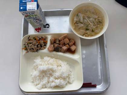 今日の給食のメニューは、鮭のしょうゆだれがけ、高野豆腐の炒り煮、五目汁、ごはん、牛乳です。鮭のしょうゆだれがけは、鮭にしょうゆの旨味がからんでごはんが進みます。高野豆腐の炒り煮はだしがきいてて、ごはんにふりかけたくなります。五目汁は野菜がたっぷり入っていて栄養たっぷりです。和食のよさが実感できる献立でした。