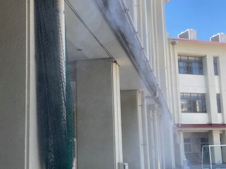 校舎壁に設置しているミストシャワーを全開にしています。少しでも温度を下げたり涼しさが感じられるようにと思っていますが、どれほどの効果があるのかはわかりません。それでも子どもたちは喜んでうれしそうに近寄っていきます。じっとミストシャワーを浴びているとそれなりに冷んやりするので、やっぱり効果はありそうです。運動会の練習も始まりますし、しばらくは活用していきたいと思います。