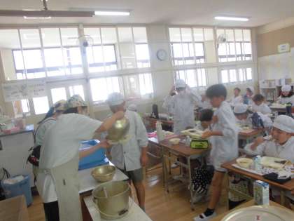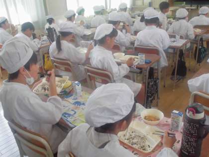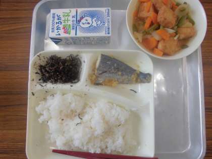 今日の給食のメニューは、さごしのおろし醤油かけ、含め煮、牛ひじきそぼろ、牛乳、ごはんでした。さごしのおろし醤油かけはさごしの身がふっくらと分厚く、少し甘めのおろし醬油が最高の組み合わせとなっていました。「サゴシ」は「サワラ」の幼魚で成長に合わせて呼び名が変わる出世魚です。含め煮は和風仕立ての煮物で、じゃがいもとこんにゃく、厚揚げ、たまねぎ、にんじん、三度豆が入っていてしっかりと味がしみ込んでいます。牛ひじきそぼろは牛ひき肉とひじきを甘辛く味つけし、しそで風味をつけています。ごはんにかけて食べました。