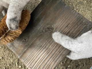 昼食の片付けが終わった後に、みんなで集合写真を撮りました。さあ次は焼き板作りです。焼き板はすでに焼いてあるので、それを一枚もらって、ひたすらたわしや軍手でこすり磨いていきます。そこに林間学習の思い出を絵や文字で表していきます。