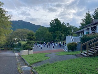 おはようございます。子どもたちはみんな元気です。朝のあいさつをしてラジオ体操をしました。山々に囲まれて、肌寒い空気がとても気持ちいいです。今日の活動も頑張っていきます。