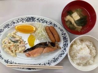 朝食です。『朝から元気に動けるようにしっかりと食べましょう』と先生が話していました。