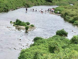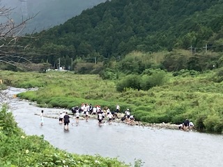 子どもたちは今、魚つかみと川遊びに夢中です。魚はあまごで模様がきれいです。範囲が広くすばしっこくて捕まえられない子が続出です。川の水も冷たくてきれいです。深さは膝までもないくらいですが、子どもたちは自ら濡れにいって、こちらもびしょびしょな子が続出です。みんな本当に楽しんでいます。