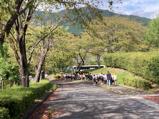 先ほど閉舎式を終え、バスに乗り込みました。過ごしやすい天候で体調を崩す子もいませんでした。みんな『楽しかった』と答えていました。計画していた活動をすべて予定通りに行うことができました。そして一つ一つの行事を全力で楽しんだり取り組んだりする子どもたちの姿に感心し、とてもうれしい気持ちにさせられました。新しい発見に素直に驚いたり、互いに協力して支え合ったり…、そんなことが進んでできる5年生の子どもたちでした。とてもすばらしい林間学習でした。それでは今から気をつけて帰りたいと思います。お家でまたお話を聞いてあげてください。