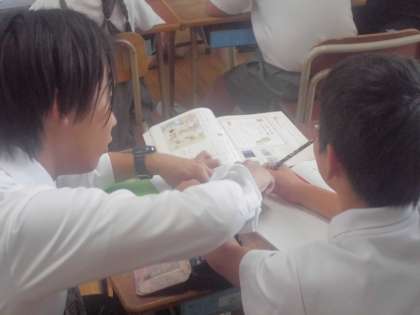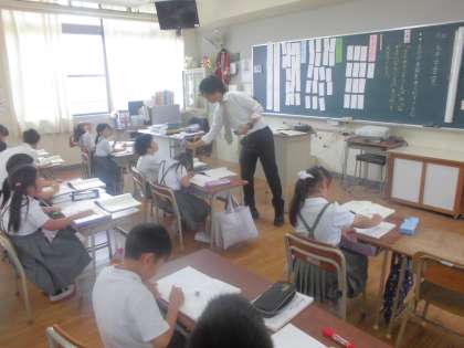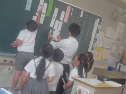 2年生の子どもたちが国語の授業で「ことばあつめ」をしていました。例えば、野菜の名前、魚の名前、料理の名前、スポーツの名前…。黒板には子どもたちの集めた言葉がいっぱい並んでいます。次に集めた言葉を使って、そこから文を作ります。例えば「わたしのすきな〇〇は〇〇です」「わたしのとくいな〇〇は〇〇です」などです。言葉を使って簡単な文を作る練習です。子どもたちはうれしそうにいくつも作って喜んで発表していました。