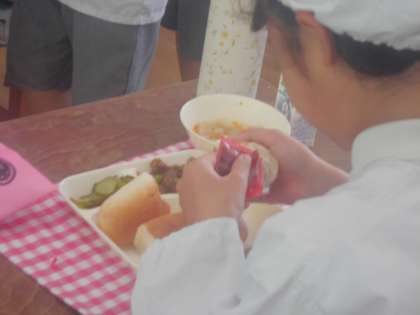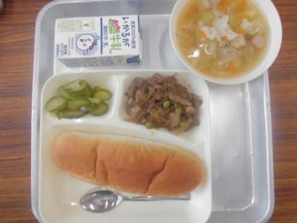 今日の給食のメニューは、牛肉のデミグラスソース煮、ウインナーのスープ、きゅうりのピクルス、牛乳、パンでした。牛肉のデミグラスソース煮は牛肉と玉ねぎを炒めて、米粉が主原料ののデミグラスソースやケチャップなどで煮ています。牛肉はやわらかく濃厚な味付けとなっています。ウインナーのスープはチキンスープをベースに塩こしょう、しょうゆで味をととのえ、ウインナーの他にじゃがいも、キャベツ、にんじん、彩りにパセリを使っています。きゅうりのピクルスはあっさりとした口あたりでした。