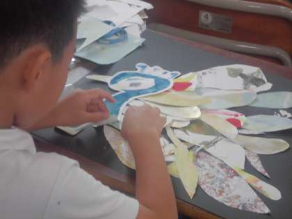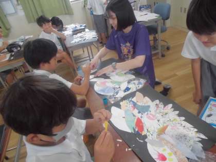 4年生の子どもたちが一生懸命に手を動かしています。図工の作品作りです。これは何だかわかりますか。そう、くじゃく(孔雀)です。写真ではとてもわかりにくいのですが、クジャクの羽の部分がとても芸術的なのです。一枚一枚の羽がさまざまな技法で描かれていて、みんなで作ったものをそれぞれ交換して貼り付けています。う〜ん、なんとも言葉ではどうにも説明が難しいです。ごめんなさい。全員の分ができて掲示されたときにぜひご覧いただければと思います。そして先生のアイデアが素敵だなと思いました。