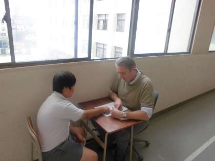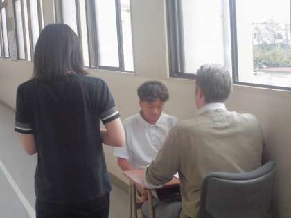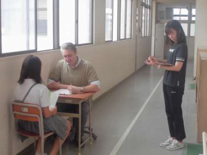 6年生の子どもたちがライアン先生と1対1のSpeaking Test(スピーキングテスト)です。横で見ていたのですが、子どもたち結構恥ずかしがるのかなと思っていたのですが、なかなかみんな堂々と受け答えしているのでちょっとびっくりしました。失敗しても上手でなくてもいいから恥ずかしがらずに自己表現することが大切だと思っていますが、あまりそんな心配もいらず、みんなしっかりと話していました。ライアン先生にも終わった後にどうでしたかと聞いてみたら「みんな上手ですよ」と私には日本語で答えてくれました。(笑)